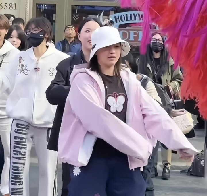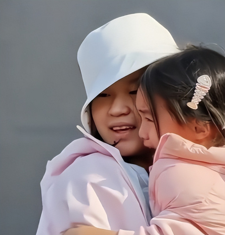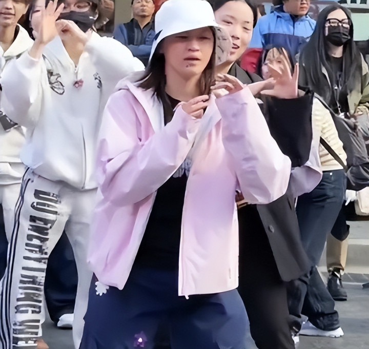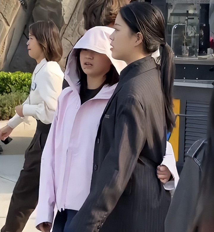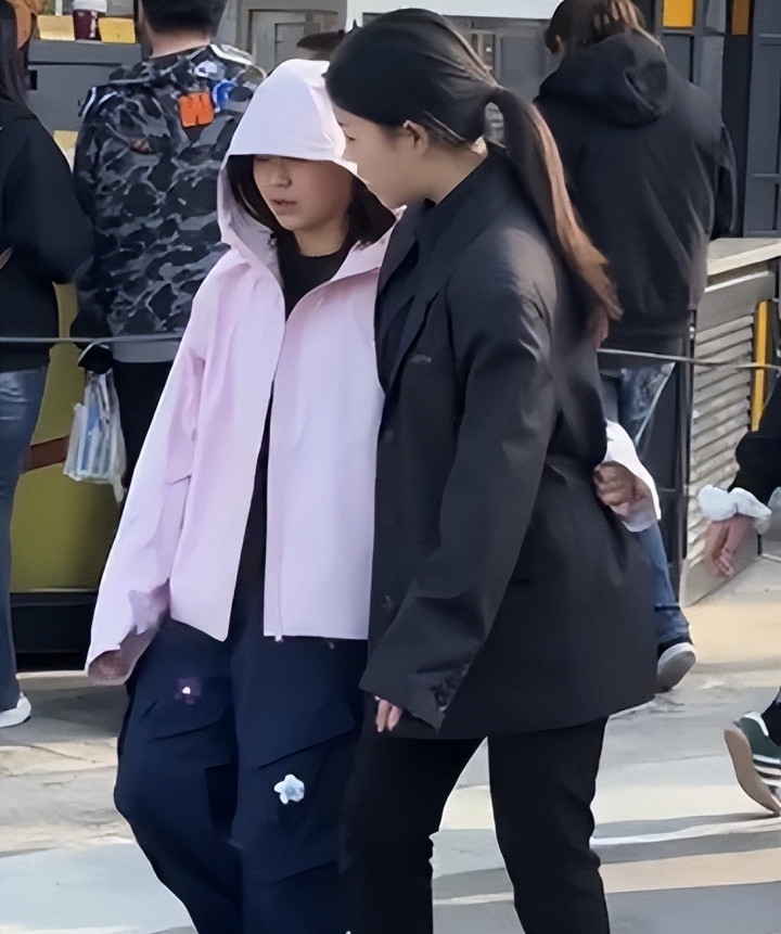 她身着一件简易的粉色外套,搭配着深色的运动裤。