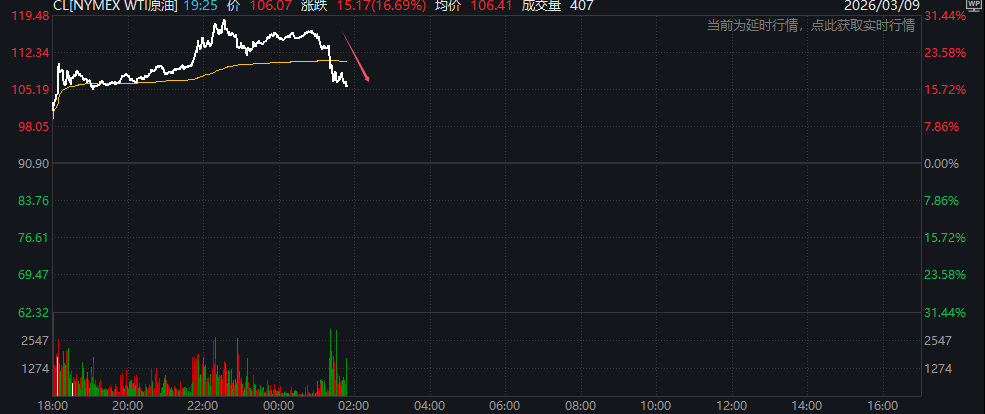 财联社3月9日讯(编辑 潇湘)周一亚洲时段尾盘,国际油价出现快速回落,美布两油双双失守110美元关口,收窄了日内涨幅,因盘中有消息称,G7财长将于周一召开紧急会议,讨论由国际能源署协调联合释放石油储备的可能性,以应对海湾冲突引发的油价飙升。