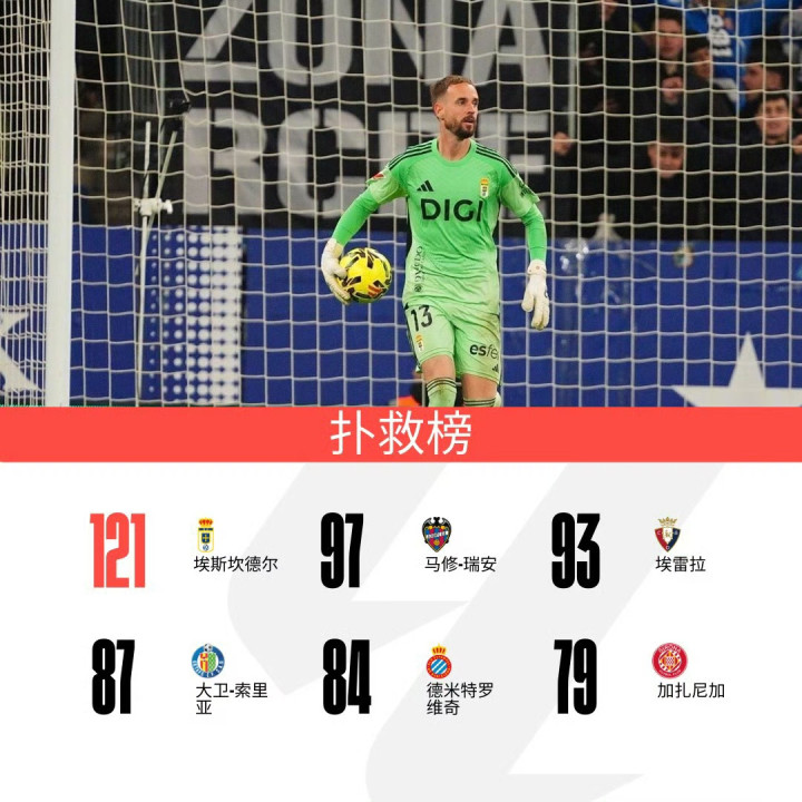 ③扑救榜方面:埃斯坎德尔121次扑救继续领跑。