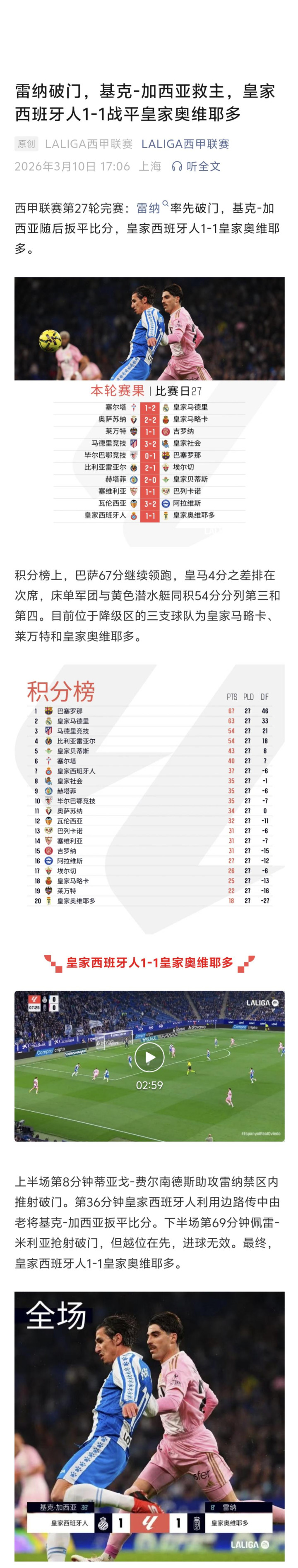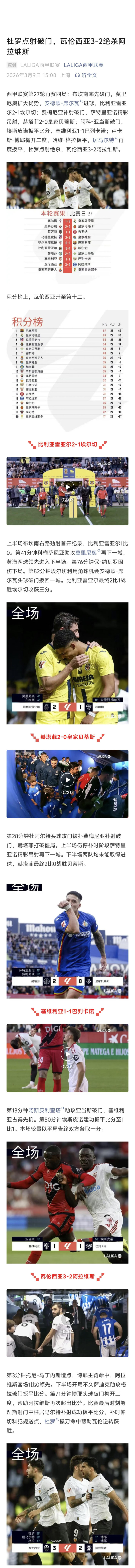 北京时间3月7日至10日,西甲第27轮完赛。皇马凭借巴尔韦德在补时阶段的幸运进球客场2-1绝杀塞尔塔,止住了联赛两连败的颓势;领头羊巴萨咋凭借亚马尔的进球客场小胜毕包。榜三和榜四的马竞和黄潜也都顺利取胜。
